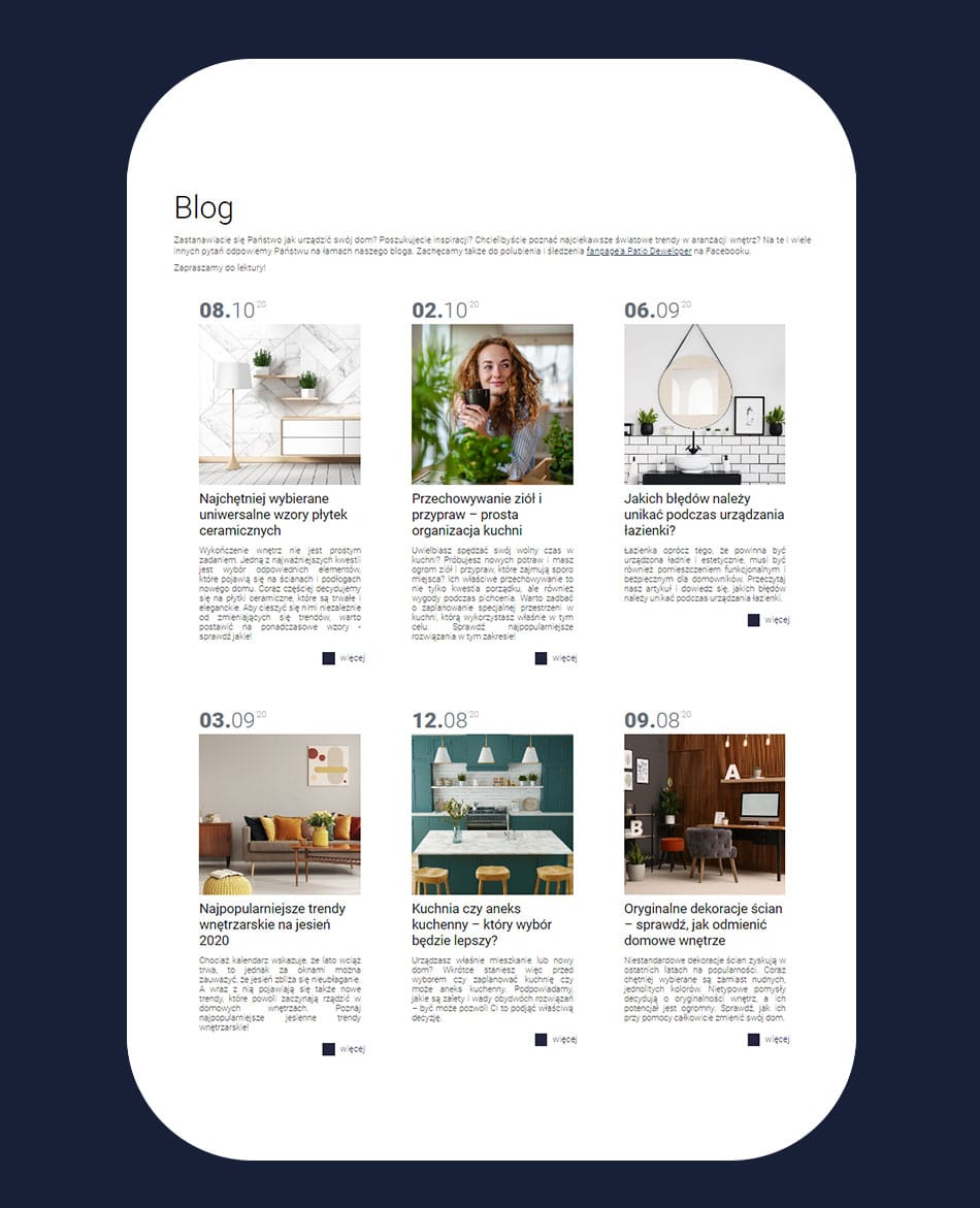 Dla obecnych, ale i przyszłych klientów Patio Deweloper, którzy poszukują inspiracji dotyczących wykończenia oraz urządzania wnętrz tworzymy bloga. Blog jest regularnie aktualizowany o nowe artykuły. Na jego łamach przybliżamy najciekawsze trendy wnętrzarskiej, dzielimy się praktycznymi poradami i omawiamy różnego typu rozwiązania aranżacji domu.